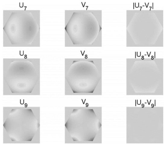 Swantner et al. [] generalized the application of Zernike polynomials with respect to annular sector apertures and verified the inference procedure by using the Gram–Schmidt orthogonalized method. Upton et al. [] optimized the Gram–Schmidt orthogonalized method and extended the method to apertures of an arbitrary shape. Taking the hexagonal aperture as an example, the feasibility of the improved Gram–Schmidt orthogonalized method was verified. A comparison of the fitting results of Zernike polynomials in terms 7–9 is shown in Figure 6. U denotes the fitting result of the circular Zernike, and V denotes the fitting result of the orthonormal hexagonal Zernike.