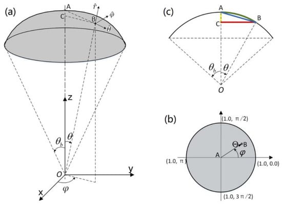 Spherical cap homeomorphic mapping to a unit circle: (a) Schematic diagram of Spherical cap of semi-aperture angle; (b) Spherical cap mapping to unit circle; (c) Mapping functions in spherical cap [].