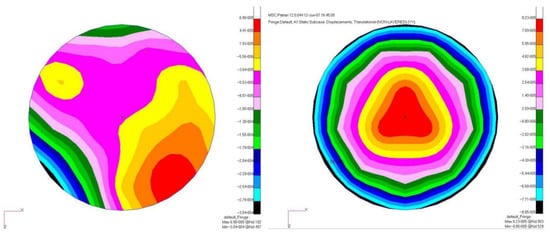 Compared with ground-based optical systems, space optical systems have a broader range of ambient temperature variations, which poses a new challenge with respect to the temperature adaptability of structures. Due to Mercury’s radiant temperature range of 100 K–700 K, the thermo-elastic analysis of high-spatial-resolution imaging cameras (HRIC) is essential for evaluating the effect of thermo-elastic deformations on optical performances under extreme thermal environmental conditions []. Dipasquale et al. used Zernike polynomials to decompose surface deformations induced by the piston/tilt of the two mirrors. A deformed camera with the contour plot of the displacements is shown in Figure 3. The ray-tracing results showed that the movement of the mirrors introduced a slight optical aberration; however, the pointing error can be neglected.