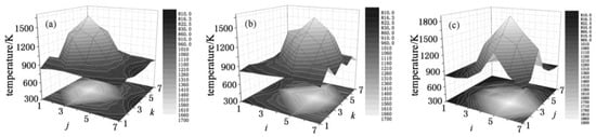 Reconstructed temperature profiles for typical cross sections: (a) Cross section i = 4; (b) Cross section j = 4; (c) Cross section k = 4 [].