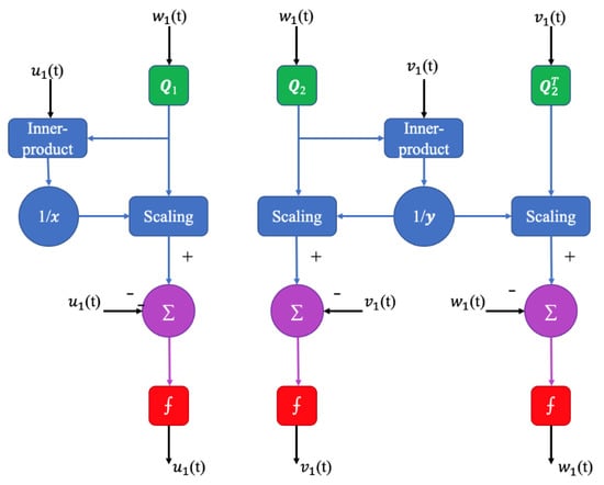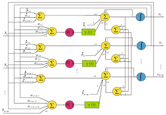 A Zhang neural network (ZNN) is a special RNN used to solve the time-varying overdetermined system of linear equations. Zhang et al. [] designed two new error functions for ZNN and verified the effectiveness using computer simulations. Zhang et al. [] proposed a varying-parameter convergent-differential neural network (VP-CDNN); the neural topology of the VP-CDNN model is shown in Figure 11 []. The algorithm can obtain a least squares solution with a super-exponential rate. VP-CDNN has more speed, accuracy, and robustness than RNN and zeroing neural networks. In addition, the VP-CDNN is also used to solve time-varying convex quadratic-programming problems [].