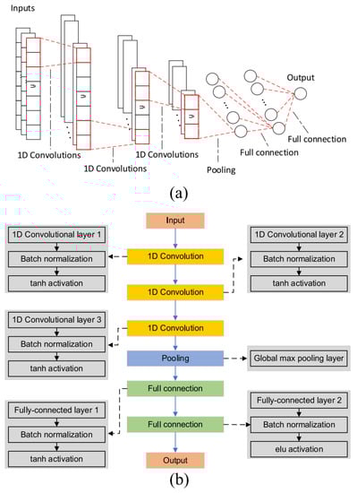 A 1D CNN model: (a) model structure; (b) model architecture [].