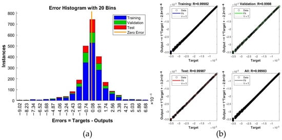Training results of 1D-CNN: (a) error histogram; (b) regression distribution.