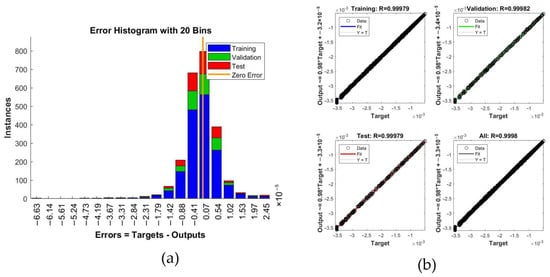 Verifying training results: (a) error histogram; (b) regression distribution.