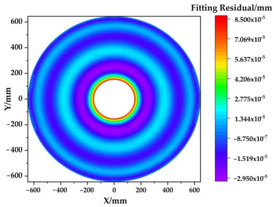 Wang et al. [] analyzed the influence of temperature on the MTF of an infrared membrane diffraction optical system, and the least squares method was adopted to solve the Zernike coefficients, thus establishing the thickness distribution model of the membrane diffractive optical components. The established model was helpful for estimating the diffraction efficiency and the MTF values for various fields of view. SAGUARO is an open source software of IOA developed by the Large Optics Fabrication and Testing group at the University of Arizona, in which the least squares method is used to fit Zernike polynomials []. Banyal et al. [,] carried out IOA on solar telescope mirrors and used SAGUARO to fit the optical surface; the fitting result is shown in Figure 5. Song et al. [] examined the effects of an irregular refractive index on optical performances and adopted the least squares method to determine the best gradient equation. The experimental results showed that the influence of the irregular refractive index effect on optical performances is one-third to one-seventh that of the thermoelastic deformation effect.