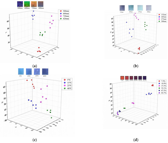 (a) Distribution of 2D photonic crystal color palettes in CIELAB color space; (b) distribution of 3D photonic crystal color palettes in CIELAB color space; (c) distribution of color palettes in CIELAB color space of photonic crystal hydrogel films at different temperatures; (d) distribution of color palettes in CIELAB color space of photonic crystal hydrogel films at different humidity.