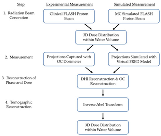 As the water is irradiated with a beam of radiation, OC captures interferograms at multiple states of the volume of water. A DHI algorithm is used to extract the relative difference in phase change between images of both the irradiated and un-irradiated states. This produces a 2D map of the integrated phase change between the two states. The 2D map of the phase change is then related to the change in optical path length, refractive index and temperature, from which the integrated absorbed dose can be determined. This process is illustrated in Figure 3, and full details of this conversion process can be found in [7,8]. The result is a 2D map of the dose integrated across the width of the test cell [8], completing Step 3 of Figure 1.