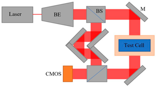 Schematic diagram of the DHI-based OC dosimeter. BE, BS, M, and CMOS denote beam expander, beam splitter, mirror, and CMOS detector, respectively. Not shown is the FLASH proton beam that irradiates the test cell.