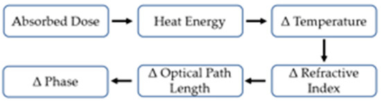 Flow diagram detailing the connection between the irradiation of the water cell and the measurement of phase by the OC dosimeter. The radiation deposits the dose, which transfers energy to the water as heat. This raises the temperature of the water, thereby increasing its refractive index. This causes an increased optical path length of a light wave probing the water, resulting in a change in the phase of the light wave.