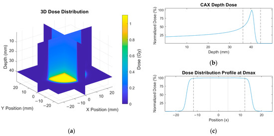 An example of the Monte Carlo-simulated proton beams generated in TOPAS is shown in Figure 4. In Figure 4a, the proton beam vertically enters the water cell from the top, depositing the dose along its beam path. The dose is normalized at a depth of 41 mm at the Bragg Peak, with the entrance dose of approximately 23%. The resulting CAX PDD generated from the 3D distribution is shown in (b), and the Dmax profile is shown in (c). To ensure low statistical uncertainty, 1 billion primary photons were generated for these simulations, with a standard error of less than 0.3% for all produced beam models.