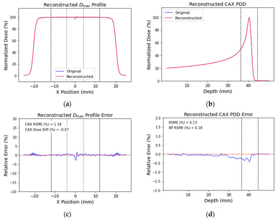 To evaluate the reconstruction accuracy, reconstructed profiles at depths corresponding to the depth of maximum dose, Dmax, and CAX PDDs were compared to the equivalent points within the original TOPAS distribution. To quantify the impact on accuracy, two metrics were used. The Root Mean Square Error (RMSE) between the original value and the reconstructed value for each point along the respective PDD or profile