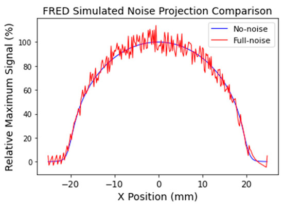 Comparison of no-noise- and full-noise-simulated projections. Profiles were taken from the no-noise and full-noise projection data at the depth of Dmax, indicating the difference in noise magnitude between the two simulations.