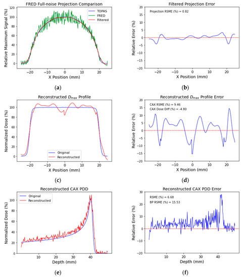 Filtering applied prior to reconstruction removed much of this noise but was unable to exactly reproduce the original projection data (Figure 8a,b). The reconstruction of the full-noise projection data using the inverse Abel transform can be seen in Figure 8. The reconstructed profile shows a reasonable approximation of the general shape of the MC-generated profile and the estimation of the edge of the beam (Figure 8c), but the variability across the profile is noticeable, with errors of up to 15% (Figure 8d). For the PDD (Figure 8e), the presence of the CAX reconstruction artefact resulted in an increased reconstruction error, with the reconstructed distribution slightly overestimated. The increase in RMSE was most notable in the BP region (Figure 8f).