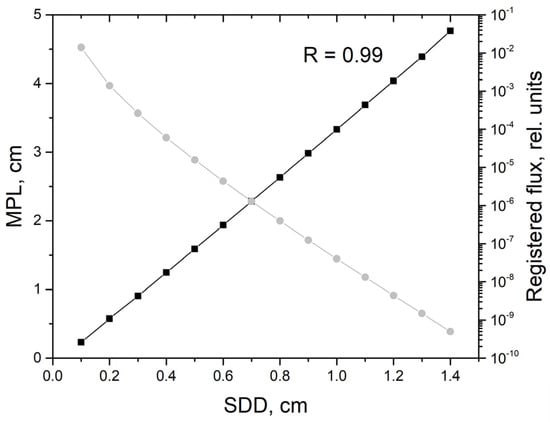 Firstly, it is interesting to estimate the MPL at different distances between the source and the detector. Figure 2 illustrates MPL and a registered flux calculated for different SDDs at the average arterial blood volume Vb0,A = 0.05 rel. units. As can be seen, MPL grows linearly with the increasing SDD and strongly correlates with it. The Pearson correlation coefficient between MPL and the SDD is 0.99. The registered flux decreases strongly with the increasing SDD. It should be noted that similar results were obtained by S. Chatterjee et al. earlier [27]. They investigated the optical path for photons in the application to PPG at wavelengths of both 660 and 880 nm and obtained a similar linear dependence of the optical path on the SDD at small distances.
