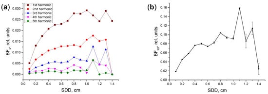 Further, we plotted the dependences of the BF level on the SDD for each of the blood volume harmonics (see Figure 3a). As can be seen, the BF level increases with decreasing the harmonic number. Herewith, the level of BF for all harmonics increases with the increasing SDD. It reaches some maximum and drops to almost zero by a distance of 1.4 cm. The total BF as a function of SDD is shown in Figure 3b. This dependence has a pronounced maximum at the SDD of 1.1 cm. After 1.3 cm, BF rapidly drops to almost zero due to the strong attenuation of the registered flux. At a distance of 1.4 cm, the registered flux is 9 orders of magnitude less than the incident one (see the gray line in Figure 2). It is also worth noting that, after a distance of 1.1 cm, the simulation error increases greatly. In general, it can be concluded that the most sensitive measurements of BF can be performed inside the SDD range from 0.8 to 1.2 cm.
