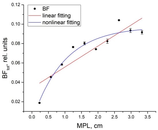 Dependence of the total BF on MPL at SDDs from 0.1 to 1.0 cm (black dots). The linear fitting curve (red line) has the equation BFtot = 0.034 + 0.022·MPL and the nonlinear fitting curve (blue line) is determined by the equation BFtot = 0.1·(1 − exp(−1.04·MPL)).