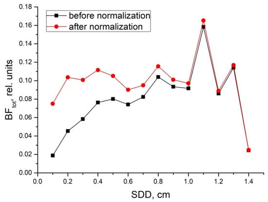 These results are presented in Figure 5. As can be seen, after the normalization all magnitudes of BFs measured converged approximately to the same level up to a distance of 1 cm and become independent of SDDs. Thus, the normalization procedure is possible. Within a short range of SDDs, inside the 0.3–1.0 cm interval, it allows standardized BF measurements to be made regardless of the real SDDs used in flowmeters’ optical probes.
