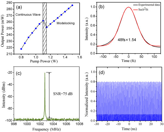 Figure 2a shows the measured output powers as the pump powers were increased. The separation distance of the grating pairs was fixed at 1.0 mm. The laser operated at a continuous wave mode under relatively lower pump powers. The laser could self-start when the pump power exceeded 1.15 W. In our experiment, the laser was investigated at a 1.5-W pump power, which generated 286 mW for the laser power, corresponding to 0.286 nJ for the pulse energy. The input pump power was measured after the isolator. The autocorrelation trace was measured by an autocorrelator (PulseCheck50 NIR, APE) and fitted by sech2. With a deconvolution factor of 1.54 (assuming a hyperbolic secant pulse profile), the pulse duration was calculated to be 48 fs, which was near-transform-limited [see Figure 2b]. The radio frequency (RF) spectrum was measured with a 10 kHz resolution bandwidth by an RF spectrum analyzer (CXA Signal Analyzer), which is exhibited in Figure 2c. The output pulse train had a fundamental repetition rate of 1.0027 GHz, with 75 dB for the signal-to-background ratio, which was in good accordance with the calculation from the cavity length. The output pulse train was measured by a 2.5 GHz photodetector (LIGHTSENSIN, LSIPD-A75) and a 4 GHz oscilloscope (AGILENT TECHNOLOGIES, DSO9404A), as shown in Figure 2d. The measured pulse train indicated high stability. In addition, there are no satellite pulses between neighbouring pulses in Figure 2d.