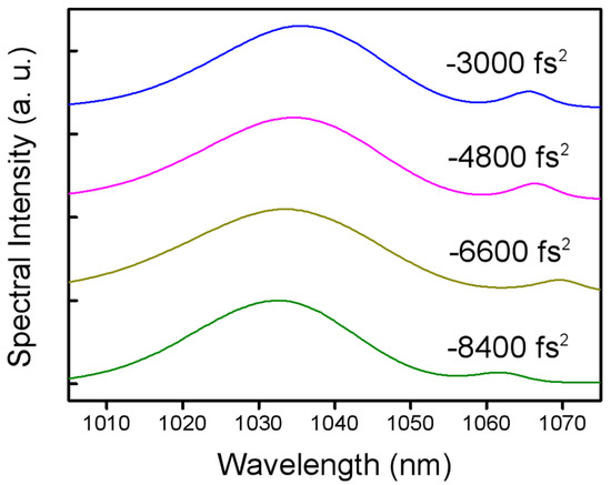 The evolution of the output optical spectra with −3000, −4800, −6600 and −8400 fs2 for the net cavity dispersion. The corresponding grating separations are 1.0, 1.2, 1,4, and 1.6 mm, respectively. The spectra were recorded with 1.5 W for the injected pump power. The measured spectra are presented in linear scales.