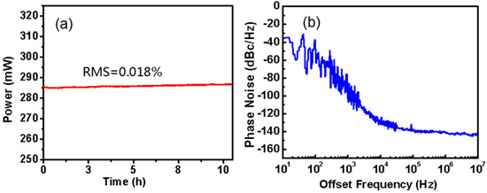 Without any enclosure of the laser oscillator, the average power of the “solid-state fiber” was measured with the full-power output for a duration of 10.5 h in Figure 4a. The average output power was ~286 mW. The root mean square (RMS) of 0.018% is presented in Figure 4a, while Figure 4b indicates the measured phase noise spectra. The values of phase noises decreased from −35 dBc/Hz to −145 dBc/Hz as the offset frequency increased from 10 Hz to 10 MHz. Both power fluctuation and phase noise characteristics indicated the stable operation of the “solid-state fiber laser”. In fact, the laser (oscillator) was used as the light source for the coherent pulse stacking amplification in our laboratory, which was able to self-start when we only increased the pump power. It had already maintained a turnkey operation for 6 months.