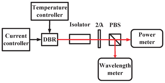 For DBR lasers, the driving current decides the output power, while the temperature can also affect the output power by changing the threshold current and the differential quantum efficiency. When the driving current exceeds the threshold current, stimulated radiation typically appears, and the laser emits light. According to the theory of the carrier rate equation, the relationship between the output power and driving current above the threshold can be expressed as in the following equation [34]:
