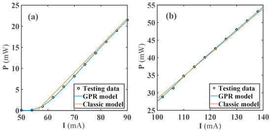 Considering that a classic model of power previously existed, we will focus on the comparison of the model proposed in this paper with the classic power model. The GPR−P model and classic model are trained using identical sets, and the testing set was used to evaluate the performance of the models. Figure 3 illustrates the predictions and errors of the two models in the testing set. We noticed that the prediction and error performance of the GPR−P model was significantly better than the classic model. The RMSE and MAE of the GPR−P model were 0.16921 mW and 0.10779 mW, respectively. Moreover, these two indicators of the classic model were 1.0078 mW and 0.65246 mW, respectively. It can be seen that the RMSE of the GPR−P model was less than one-fifth of that of the classic model. In order to observe the difference between the two models more intuitively, we selected the current and power fitting of the two models at a specific temperature for comparison. Figure 4 shows the comparison of the classic model and the GPR model. The current and power in the classic model had a linear relationship. The comparison chart was divided into two ranges for illustration. In the threshold (50 mA) to 90 mA, the classic model was in poor agreement with the test value. Its linear characteristics could not be applied to the power near the threshold value, while the GPR−P model could better match the test data. As the current increased, the GPR−P model performed well from 90 mA to 140 mA. While the classic model could only fit the data in the range of 110–115 mA, there were certain deviations from the test set in other intervals. Further analysis showed that the classic model could not accurately describe the actual output power of the DBR laser, especially in an extensive current range. We confirmed that the GPR−P model could predict the power well near the threshold current and at high currents. This new model is pivotal in power control under different numerical requirements.
