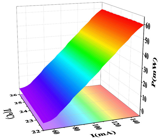 When the injection current is constant, the threshold current and the external differential quantum efficiency show an exponential change with the temperature change. In summary, the widely accepted relationship between power, current, and temperature is expressed as [35]