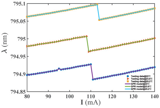 The relationship between the DBR laser output wavelength and the input current and temperature was described by the GPR− model. As a way to model power, we used the training set to optimize the model’s parameters. Furthermore, the remaining test was set to test the model’s performance. The RMSE of the GPR− model was nm. Mode hopping existed in the DBR laser. An accurate description of the position of the mode hopping point is essential for controlling the laser frequency. Figure 6 illustrates the wavelength change, with the current rising at a fixed temperature in the test results of the GPR− model. It was observed that there was a mode hopping point in the change process for the current’s rise at a specific temperature, and the model provided a good fit for the data points near the abrupt change. It can be seen that the GPR− model could accurately describe the output wavelength of the DBR laser.
