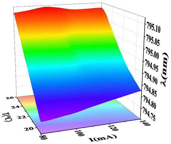 Based on this model, a wavelength change in an extensive range of current and temperature variations would be determined, which could play an essential role in high-precision and high-efficiency control of the DBR laser frequency. We used the GPR− model to predict the DBR laser for injection currents ranging from 80 mA to 140 mA and for temperatures ranging from 19 °C to 26 °C, as shown in Figure 7. In the continuous interval of the non-mode-hop point, there was a marked rise in the wavelength with the increase in temperature and current. The GPR− model clearly described the mode hopping position of this DBR laser, which could help us avoid unstable points in laser wavelength control to achieve precise and efficient laser frequency control.