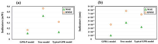 Indicators of using different models in power and wavelength prediction. (a) Indicators in power prediction. (b) Indicators in wavelength prediction.