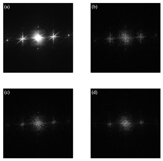 Figure 2a shows the captured image plane hologram, and the spectrum of the hologram is obtained by the Fourier transform of Figure 2a, and then the spectrum is transformed into the amplitude spectrum, as shown in Figure 2b. This operation can avoid the poor segmentation results caused by the inconspicuous edge information of the object’s optical spectrum. It is clear from the figure that the hologram spectrum is divided into three regions, namely, zero-order background information, +1 term object information, and −1 term conjugate object information. In addition, it can be seen that the amplitude spectrum makes the object’s light information more obvious, which is more beneficial for the subsequent edge detection step.