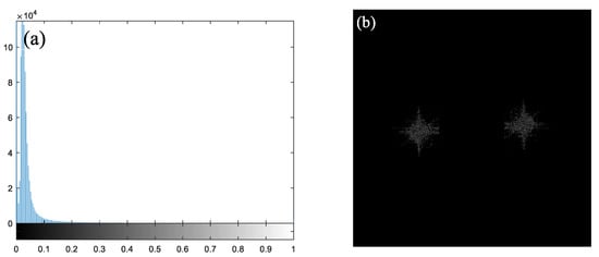 Figure 4a shows the gray histogram of the low-frequency component after morphological operations. The overall shape of this image histogram is that of a single peak, that is, there is only one main peak. The reason for this is that the object region has a small area relative to the background region. For such images, traditional methods such as the maximum between-class variance (Otsu method) do not find a suitable threshold [31], and the Otsu method is suitable for gray histograms that show a double-peaked shape. The histogram inflection point, which is the value of the dividing point between the low- and high-gradient regions of the single-peaked histogram, is found and used as a threshold. The method is simple and fast to process. After threshold, the binary image of the low-frequency component is shown in Figure 4b, from which it can be seen that the low-frequency component maintains the shape of the original spectrum compared to the original spectrum.