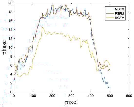 Figure 10a,b shows the phase diagrams reconstructed by the method proposed in this paper, and when the noise increases, the results do not differ much; thus, the method has a certain degree of noise resistance and effectiveness. Figure 10c,d shows the reconstructed results of the region-growth method, and it can be seen that the reconstructed results have phase loss when the noise is small, and as the noise increases, the reconstructed results of the method show serious deformation, the phase loss is more serious, and the shape of the object cannot be seen; therefore, the segmentation accuracy of the region-growth method is affected by the noise, and the robustness is poor. Figure 10e,f shows the reconstruction results of the iterative-thresholding method, and the reconstruction results are better when the noise is smaller, and when the noise increases, the reconstruction results have phase loss; therefore, this method is also affected by the noise. To evaluate these filtering methods more intuitively, we select the 1-D phase profile at the same position (black dashed line) in Figure 7 and compare it with the traditional manual filtering method, as shown in Figure 11.