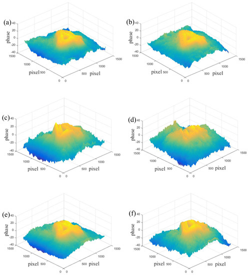 Reconstructions of the phase with different spatial filtering methods: (a) PSFM, speckle noise with a mean 0 and variance of 0.02; (b) PSFM, speckle noise with a mean of 0 and variance of 0.04; (c) RGFM, speckle noise with a mean of 0 and variance of 0.02; (d) RGFM, speckle noise with a mean of 0 and variance of 0.04; (e) ITFM, speckle noise with a mean of 0 and variance of 0.02; (f) PSFM, speckle noise with a mean of 0 and variance of 0.04.