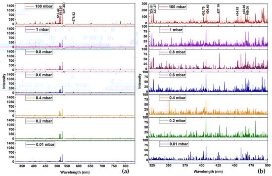 LIBS is one of the powerful spectroscopic techniques to determine the plasma parameters by measuring the atomic emission intensity and wavelength [35,36,37]. The atomic emission spectrum of the copper metal is recorded in the wavelength range of 325–840 nm, excluding the laser excitation wavelength, at ambient air pressure (P) variations from 0.01 mbar to 100 mbar. The plasma plume images at different ambient pressures for 500 ns gate width, captured through an entrance slit of width 2500 μm, are shown in Figure 2. Upon laser ablation, electrons, ions, and neutral atoms of the target are ejected and travel in the forward direction, constituting the plume. The velocities of the plasma constituents vary with their masses, emitted direction, and ambient gas pressure. At low pressures, the resistance to the movement of plasma species being less, the plume expands above the target surface showing the weak confinement of plasma. The plasma density being less, the spectral intensity is also less. The spectra recorded under different chamber pressure are shown in Figure 3. The increase in chamber pressure restricts the motion of plasma species, thereby preventing the expansion of the plasma plume. The plasma confinement to a smaller volume at 100 mbar, shown in Figure 2, justifies this. The increased confinement effect of plasma with ambient pressure leads to an enhanced collision rate of the plasma species and the release of energy appearing as an increase in spectral intensity and plasma, which is evident from the variation of the hottest region in the image of the plasma plume. Figure 2 also shows the detachment of the plasma plume from the target surface, which can be explained by the plume expansion and subsequent cooling with the trailing end of the laser pulse. Upon cooling, after the trailing end of the laser pulse, the cooler adjacent air molecules rush in and detach the hotter region of the plasma plume from the target surface.