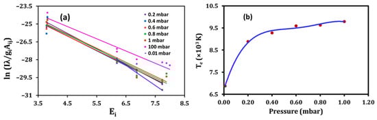 where Te is the plasma electron temperature, kB is Boltzmann’s constant, and gi and gj are the degeneracy of excited i and ground j state. The minimum electron density (Ne) necessary for the LTE between two states separated in energy by ΔE (in eV) is a function of Te(K) and is given by the McWhirter criterion (Equation (2)) [24]. Under the LTE condition, the Te is calculated from the intensities (Equation (3)) of spectral lines using the Boltzmann plot method [22,25,26].