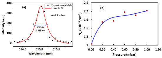 The width of peaks in the plasma spectrum, shown in Figure 3, is a function of the plasma electron density, Ne, which can be estimated from the average FWHM of the Stark-broadened profile of the non-overlapped peaks in a spectrum. For example, at pressure 0.2 mbar, the peaks corresponding to Cu I—402.67, 406.52, 454.02, 459.63, 466.04, 510.42, 515.07, and 521.48 nm—are considered for the calculation of Ne using the value of ω from the literature [40,41] in Equation (6). The representative peak at 515.07 nm at a pressure of 0.2 mbar for Cu I, showing stark broadening, is displayed in Figure 5a. Out of the three broadening mechanisms—Doppler broadening, collision broadening, and stark broadening—the third is the dominant broadening mechanism in the laser plasma, which influences the spectral linewidth more. The local electric field greatly influences the spectral emission from the densest region of the plasma, leading to a stark broadening and shift in the atomic and ionic emission line. The pressure dependence of Ne in the range of 0.01 mbar to 1 mbar is shown in Figure 5b. The study reveals that irrespective of the chamber pressure, the value of Ne is greater than the critical value set by McWhirter’s criterion, indicating the LTE condition. It can also be understood from Figure 5b that Ne increases, with P reaching a value of 2.24 × 1016 cm−3 at 100 mbar, which agrees well with the explanation given for plasma plume and Te. The greater the chamber pressure, the greater the number of air molecules in contact with the target surface, which plays a significant role in the energy exchange between them. The higher P reduces the mean free path of the species in the plasma, producing denser plasma with higher temperatures [42].