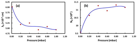 Variation of (a) Debye length, λD (R2 = 0.9288), and (b) number of particles in the Debye sphere, ND (R2 = 0.9570), with ambient air pressure.