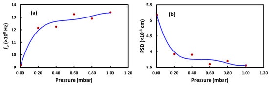 Variations in (a) electron plasma frequency, fp, (R2 = 0.9613) and (b) plasma skin depth, PSD, (R2 = 0.9718) with ambient air pressure.