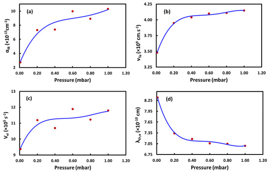 The IB becomes significant when the electron in the plasma absorbs a photon and thereby undergoes a momentum change. Such absorption is a highly dominant mechanism of photon absorption in laser plasma. From Figure 5b and Figure 6b, it is evident that Ne and ND increase with P. The variation of IB co-efficient, αIB, with P from 0.01 mbar to 1 mbar is shown in Figure 8a. The value of αIB at 100 mbar is 9.78 × 10−15 cm−1. As the increase of P increases Ne and ND, the probability of interaction of a photon with an electron in the plasma becomes high, which accounts for the increased absorption leading to the IB. As IB changes the electron momentum, the electron thermal velocity () also changes. The variation of average velocity , calculated using Equation (11), with P is shown in Figure 8b. The increase of Te, Ne, ND, and with P enhances the electron–ion collision frequency (Vei), as shown in Figure 8c. The increase of with Te which in turn with P increases the electron momentum and, hence, lowers the electron de Broglie wavelength (λth,e), is shown in Figure 8d.