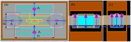 Rectangular grating array excited by four incident beams with varying phases from to as shown in the top, front, and side views in (a–c), respectively. The polarization directions of the excitation beams are indicated by blue arrows, the grating slits by light blue lines, and the monitors a, b, and c are marked by yellow frames.