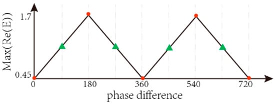Furthermore, it is crucial to keep the uniformity of the SPP focal spot intensity during the process to ensure stable particle transport. To tackle this concern, simulations were carried out exclusively on the horizontal gratings. The electric field at the center of the structure is depicted in Figure 3. As it can be observed, when the phase difference between two horizontal excitation beams is 0°, 360°, and 720°, the electric field reaches its lowest point. Although the electric field attains its maximum at 180° and 540°, it exhibits only two steps in a cycle. In this two-step cycle, as the focal spots move ahead by 1/2 cycle, the captured particles will fall behind and be positioned in the center of the new focal spots, thus resulting in a zero force, and hindering any further movement. Conversely, the electric field remains constant when the phase difference is 90°, 270°, 450°, and 630°. In this four-step cycle, as the focal spots move ahead by 1/4 cycle, the captured particles remain inside the new focal spots, hence attracting them towards the center of these new focal spots. Additionally, there are other four phase groups that exhibit the same maximum real part of the electric field; however, taking into consideration both the electric field intensity and equidistant steps, 90°, 270°, 450°, and 630° are the optimal choices.
