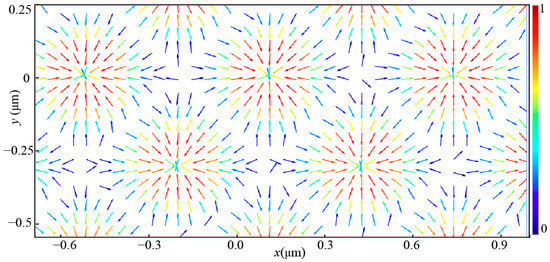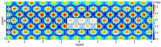 The electric field distribution measured by monitor “a” is depicted in Figure 4. The SPP focal spots are generated and arranged in a uniform manner. Electric field vectors at the focal spots extend from the outside to the inside in rows ①, ③, and ⑤, while in rows ② and ④, they extend from the inside to the outside. The optical gradient force, which depends on the intensity gradient and points in the direction of maximum intensity, enables each focal spot to serve as a trap, capturing particles to its center. Furthermore, as focal spots are moved horizontally, each row of focal spots can function as a transport channel thus forming multiple horizontal transport channels. It is important to note that the SPP focal spots near the upper and lower gratings are weak and severely distorted, thus unable to support particle capture and transport. This structure features five effective transport channels, with the number of channels determined by the length of the left and right grating slits, and the transport distance dependent on the length of the upper and lower grating slits. Consequently, the number of channels and transport distance can be tailored to meet specific needs. It is worth mentioning that while increasing the number of channels will improve transport efficiency, it will also lower capture efficiency due to the attenuation of SPP.