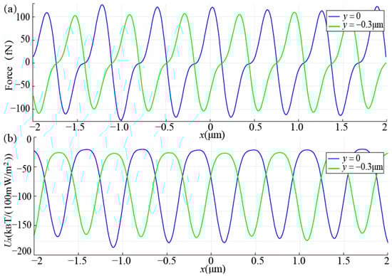 The graphical representation of the optical force and trapping potential energy exerted on the target particle along y = 0 (blue line) and y = −0.3 μm (green line) can be found in Figure 6. These two lines correspond to the center lines of channels ③, and ④, respectively. As shown in Figure 6a, the horizontal gradient force in both channels exhibits a uniform periodic change, with multiple force balance points forming at the center of each channel’s focal spots. This results in a pulling force towards each balance point from both sides, demonstrating the presence of multiple effective traps in each channel which significantly improves the capture efficiency. In addition, the comparison of y = 0 and y = −0.3 μm reveals a greatly similar force distribution, with only a half-period lag, implying that multiple channels can be utilized for particle transport.