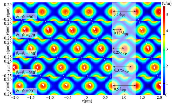 where and are the initial phases of two SPP waves. The phase difference between the SPPs is solely dependent on the phase of the illuminating excitation beams, as they impinge on the gratings at a perpendicular angle, i.e., [7,31]