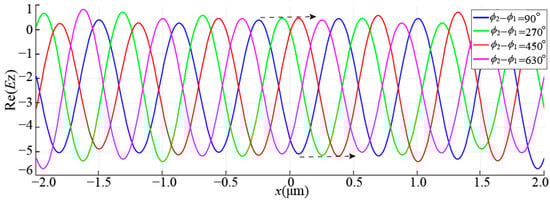 Linear electric field intensity along the x-axis when the phase difference of the excitation beams changes. Arrows represent moving direction.