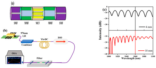 The transmission characteristic of the interference filter is measured using a homemade amplified spontaneous emission (ASE) light source, as shown in Figure 1b. An OSA (Optical Spectrum Analyzer, AQ 6374) is used to collect the light from the interference filter. Figure 1c shows the transmission spectra of the interference filter. When the length of the MCF is chosen to be 4 mm, the FSR around 1060 nm of the upper transmissivity curve in Figure 1c is estimated to be 15.44 nm, with a 3 dB bandwidth of 8.40 nm. When the length of the MCF is selected as 10 mm in the lower of Figure 1c, the FSR and the 3 dB bandwidth around 1060 nm are 8.60 nm and 4.84 nm, respectively.
