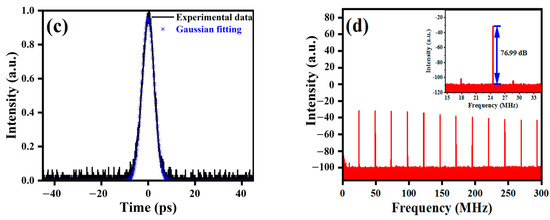 Figure 4 shows the pulse characteristics when the length of MCF is chosen to be 10 mm. The FSR of the interference curve around 1060 nm is estimated to be 8.60 nm, with a 3 dB bandwidth of 4.84 nm. The pump power is kept at 3.3 W. Figure 4a gives the spectrum in logarithmic coordinates, showing a central wavelength and 3 dB bandwidth of the spectrum of 1045.57 nm and 16.20 nm, respectively. The pulse sequence recorded by the oscilloscope is depicted in Figure 4b, showing a repetition rate of 23.69 MHz. As shown in Figure 4c, the pulse duration is estimated to be 35.07 ps, assuming a Gaussian shape. We have also measured the RF signal to evaluate the stability of the mode-locked fiber laser. Figure 4d shows the results with a resolution of 100 Hz in the spectrum range from 0 to 300 MHz, and the inset shows the RF signal with a resolution of 10 Hz in the spectrum range from 13.69 MHz to 33.69 MHz. The S/N ratio is greater than 50 dB, indicating that the laser maintains a stable mode-locked state.