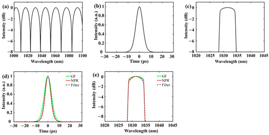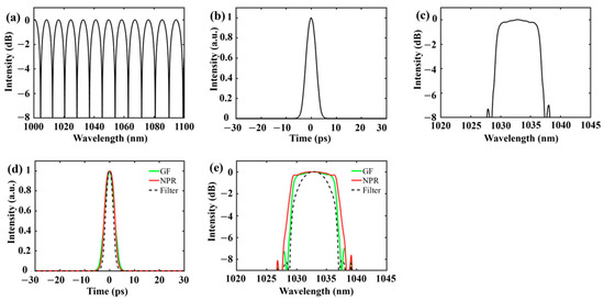 The FSR of the filter transmission curve around 1060 nm is firstly set to be 15.25 nm. By appropriately setting the parameters of the cavity, stable pulses have been obtained. Figure 5 give the characteristics of the pulse. Figure 5a shows the transmission curve of the filter. The 3 dB bandwidth around 1060 nm is about 7.65 nm. Figure 5b depicts the pulse profile. The pulse duration is estimated to be 7.26 ps. As shown in Figure 5c, the 3 dB bandwidth of the spectrum is 5.85 nm. Figure 5d,e give the pulse shape and spectra at different locations of the cavity. The green solid lines, the red solid lines, and the black dashed lined depict the pulse shape and spectra after gain fiber, nonlinear polarization rotation and filter, respectively. The pulse and spectrum are broadened in the gain fiber. The filter and nonlinear polarization reshape them in the time and frequency domains. Comparing Figure 5c to Figure 3a, the simulation results agree with experimental results well.