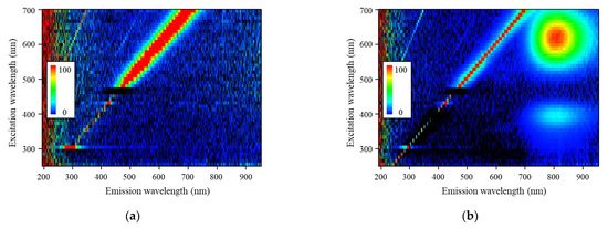 PL excitation/emission maps of the 0.5% Li-doped CaF2 ceramic (a) before and (b) after ionizing irradiation. The horizontal and vertical axes indicate emission and excitation wavelengths, respectively.